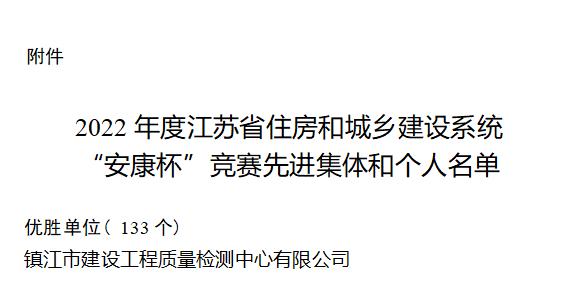 近日,江苏省住房和城乡建设系统安康杯竞赛领导小组发布了《关于2022年度江苏省住房和城乡建设系统“安康杯”竞赛先进集体和个人的通报》,检测中心荣获2022年度江苏省住房和城乡建设系统“安康杯”竞赛先进集体。
