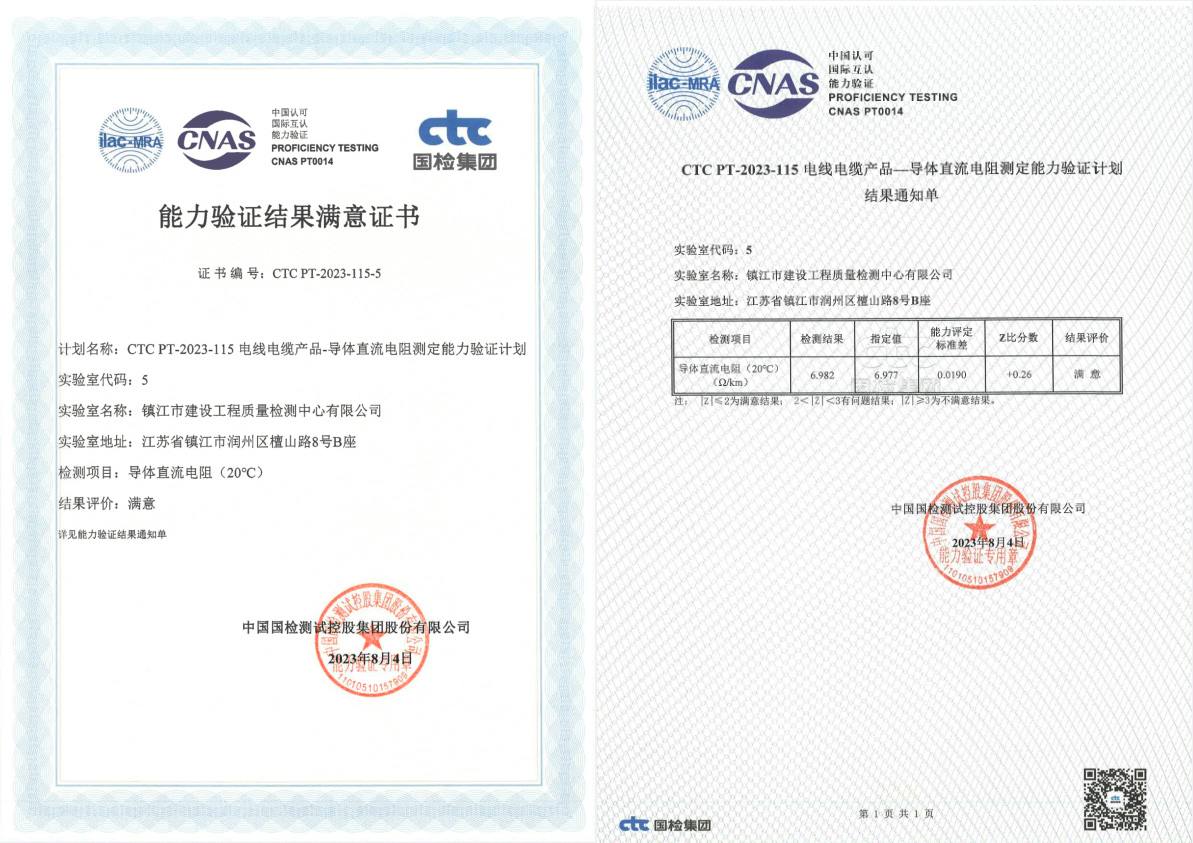 2023年5月,检测中心参加了“CTC PT-2023-115电线电缆产品——导体直流电阻测定能力验证计划”。近日,检测项目提交的结果评价为“满意”(Z比分数:0.26),顺利通过此次能力验证。